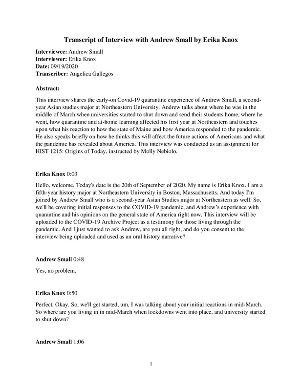 This interview shares the early-on Covid-19 quarantine experience of Andrew Small, a second-year Asian studies major at Northeastern University. Andrew talks about where he was in the middle of March when universities started to shut down and send their students home, where he went, how quarantine and at-home learning affected his first year at Northeastern and touches upon what his reaction to how the state of Maine and how America responded to the pandemic. He also speaks briefly on how he thinks this will affect the future actions of Americans and what the pandemic has revealed about America. This interview was conducted as an assignment for HIST 1215: Origins of Today, instructed by Molly Nebiolo.