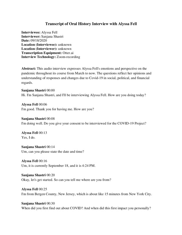 This audio interview expresses Alyssa Fell's emotions and perspective on the pandemic throughout its course from March to now. The questions reflect her opinions and understanding of responses and changes due to Covid-19 in social, political, and financial regards.