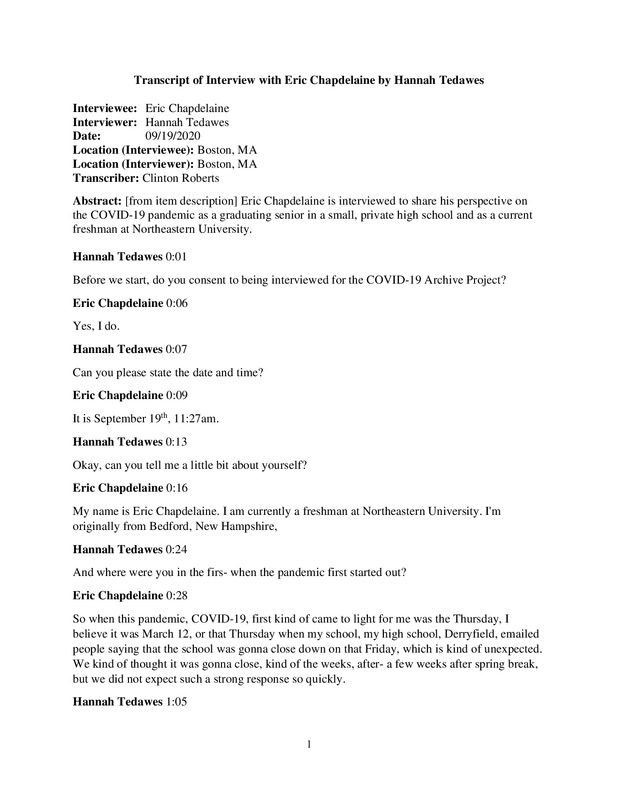 Eric Chapdelaine is interviewed to share his perspective on the COVID-19 pandemic as a graduating senior in a small, private high school and as a current freshman at Northeastern University.