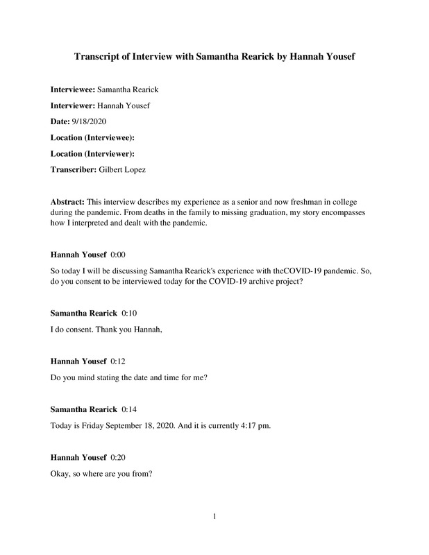 This is an interview with a college freshman and her experience with the pandemic. This mainly covers how the year changed during the 2nd semester of high school, and the resulting summer.