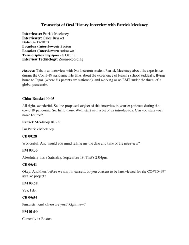 This is an interview with Northeastern student Patrick Mceleney about his experience during the Covid-19 pandemic. He talks about the experience of leaving school suddenly, flying home to Japan (where his parents are stationed), and working as an EMT under the threat of a global pandemic.