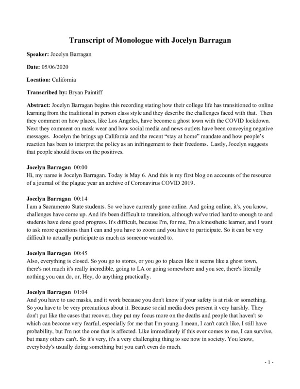 Oliver Kaplan begins this recording by stating how the monologue is for a college assignment in their “China in the world” class. They then speak about how they were aware of the virus well before its spread across the world, due to the class they were taking. Initially Oliver thought the virus would be contained in China, but realized that it was going to become a larger issue when he noticed anti-Chinese sentiments at his college in Maine. Oliver then describes how shortly after that his school shut down and he returned to his home in California. Oliver concludes this recording by talking about local political policies in Los Angeles and hopes the lockdown will end soon.