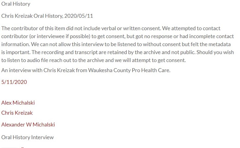The contributor of this item did not include verbal or written consent. We attempted to contact contributor (or interviewee if possible) to get consent, but got no response or had incomplete contact information. We can not allow this interview to be listened to without consent but felt the metadata is important. The recording and transcript are retained by the archive and not public. Should you wish to listen to audio file reach out to the archive and we will attempt to get consent.