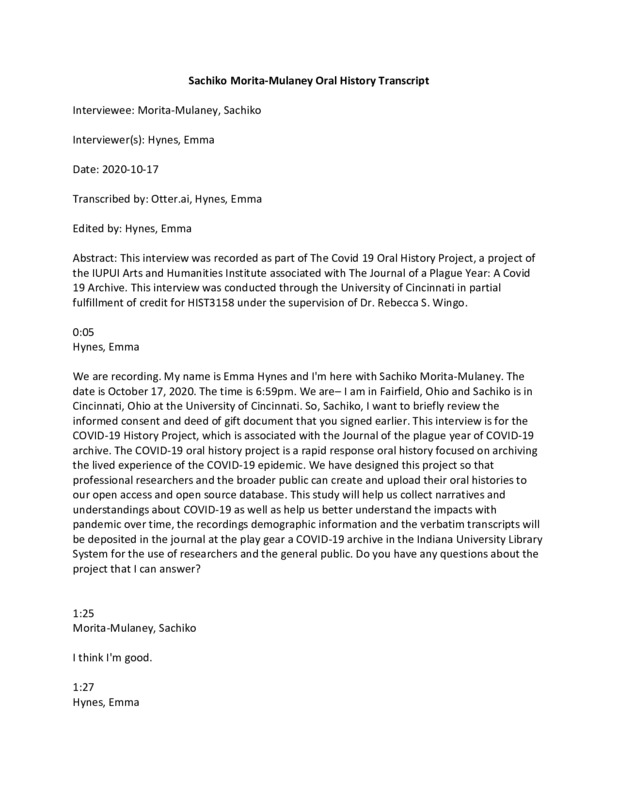 This is an Oral History interview with University of Cincinnati student Sachiko Morita-Mullaney. Sachiko discusses her experience as a student at the University of Cincinnati. She brings up her identity as a Japanese-American woman and how that has affected her personally during the pandemic due to anti-Asian racism. She also talks about her small online business, and the different ways her and her family’s employment have been affected by Covid-19. Sachiko, a Political Science major at the University of Cincinnati, is very informed about the government’s response to Covid-19. She shares her opinions about healthcare in the United States and how racism and classism have affected the United States’ response to the coronavirus. Finally, we talked about the future and the quality of the US response to the coronavirus.
