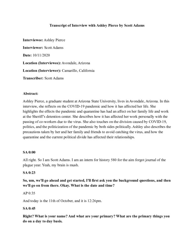 Ashley Pierce, a graduate student at Arizona State University, lives in Avondale, Arizona. In this interview, she reflects on the COVID-19 pandemic and how it has affected her life. She highlights the effects the pandemic and quarantine has had an affect on her family life and work at the Sheriff’s detention center. She describes how it has affected her work personally . She also touches on the division caused by COVID-19, politics, and the politicization of the pandemic by both sides politically. Ashley also describes the precautions taken by her and her family and friends to avoid catching the virus, and how the quarantine and the current political divide has affected their relationships.