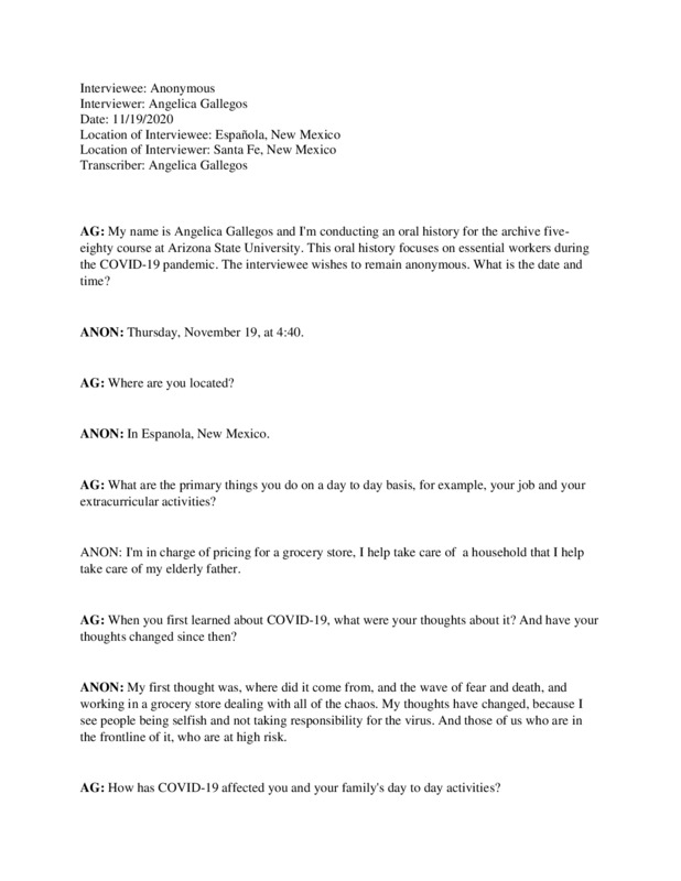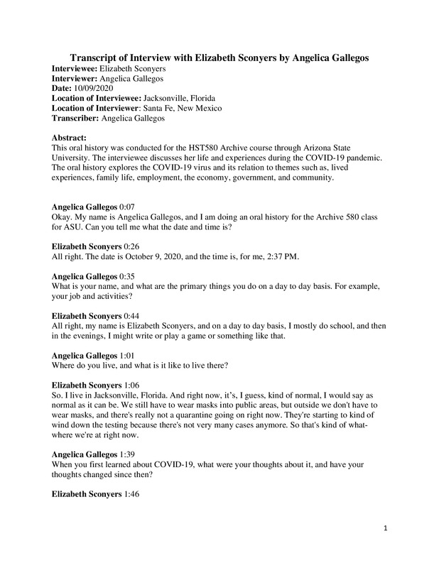 This oral history was conducted for the HST580 Archive course through Arizona State University. The interviewee discusses her life and experiences during the COVID-19 pandemic. The oral history explores the COVID-19 virus and its relation to themes such as, lived experiences, family life, employment, the economy, government, and community.