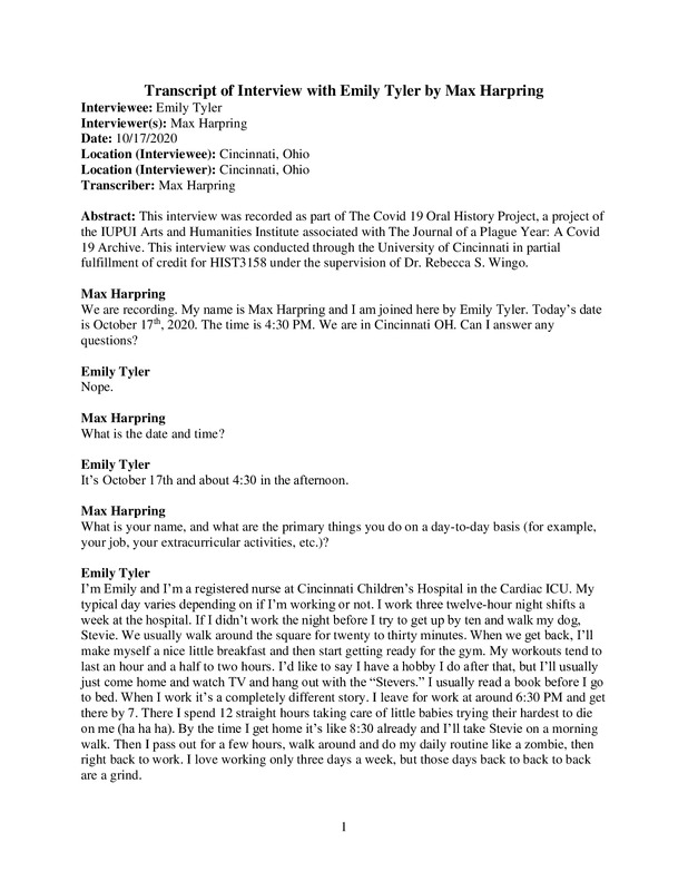 Transcription only: In this oral history interview, I sat down and interviewed Emily with a range of topics including: her background, employment, family, household, community, health, information sources, government, and the future. This interview was conducted at Emily’s apartment in Cincinnati, Ohio. Informed Consent was obtained previously before the interview.