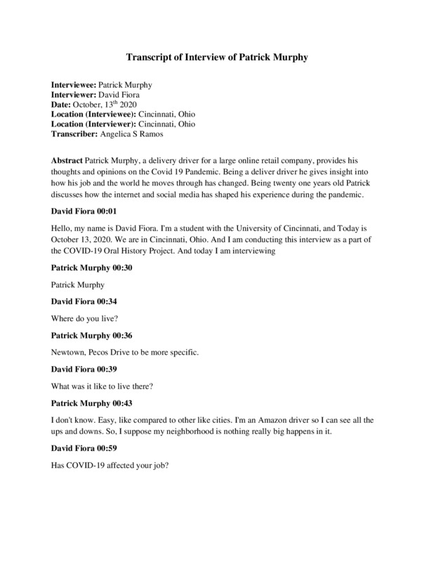 Patrick Murphy, a delivery driver for a large online retail company, provides his thoughts and opinions on the Covid 19 Pandemic. Being a deliver driver he gives insight into how his job and the world he moves through has changed. Being twenty one years old Patrick discusses how the internet and social media has shaped his experience during the pandemic.