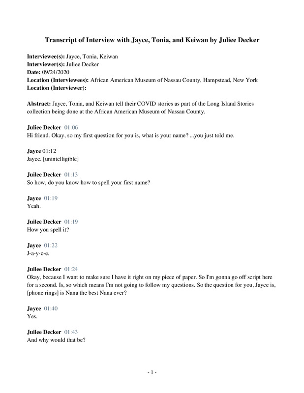 Jayce, Tonia, and Keiwan tell their COVID stories as part of the LongIslandStories collection being done at the African American Museum of Nassau County