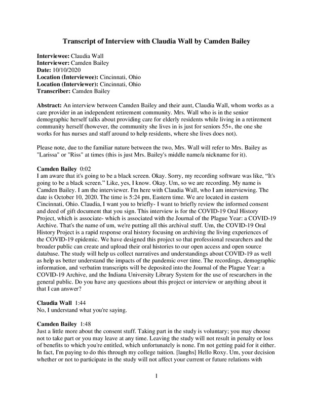 An interview between Camden Bailey and their aunt, Claudia Wall, whom works as a care provider in an independent retirement community. Mrs. Wall who is in the senior demographic herself talks about providing care for elderly residents while living in a retirement community herself (however, the community she lives in is just for seniors 55+, the one she works for has nurses and staff around to help residents, where she lives does not).