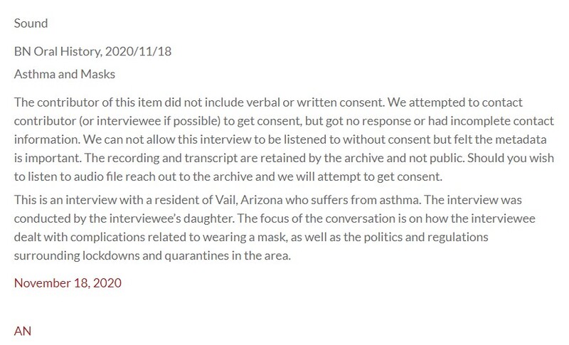 The contributor of this item did not include verbal or written consent. We attempted to contact contributor (or interviewee if possible) to get consent, but got no response or had incomplete contact information. We can not allow this interview to be listened to without consent but felt the metadata is important. The recording and transcript are retained by the archive and not public. Should you wish to listen to audio file reach out to the archive and we will attempt to get consent.