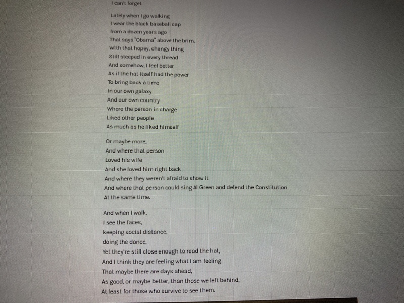 When I read this poem by Don Arbor called “For Better or Worse”, I instantly felt connected because we all are facing the same problems throughout this pandemic. We feel the need to stay home and stay away from others but are able to still virtually be there for one another. We might not be able to experience life in the same aspect as we use to, but we have to expect for better days to come. One thing that stuck out was how he was still able to appreciate what he has in this exact moment instead of being negative. He states that he is grateful and lucky, but he will never be able to forget something so disheartening. In the fourth stanza all the way to the end, he starts to get into politics and describes how things were a few yeas ago when Obama was president. Don Arbor discusses how Obama cared about the American people just as much as he cared about himself. He was willing to stick to his morals and be active within the government compared to what is happening right now. Don believes that most individuals feel how he is feeling and that the possibility of better days are yet to come.