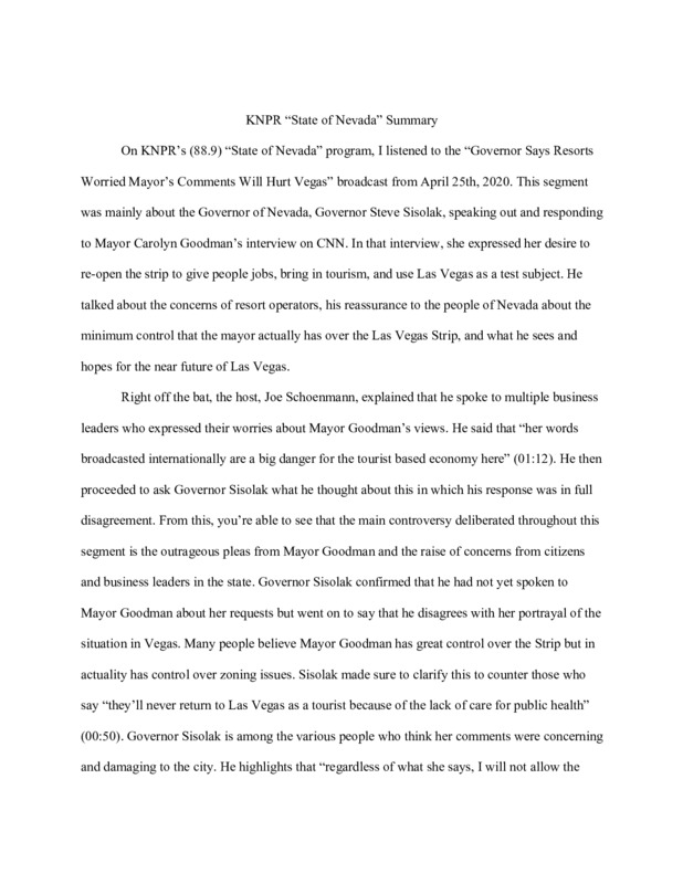You must complete your summary on a broadcast of a KNPR (88.9 FM Radio) “State of Nevada” program, which is broadcast from 9-10am and 7-8pm Monday through Friday. From time to time, an alternative program airs in its place: Be certain you are listening to the “State of Nevada.” Previous days’ programs are available on streaming audio online. To access podcasts online: