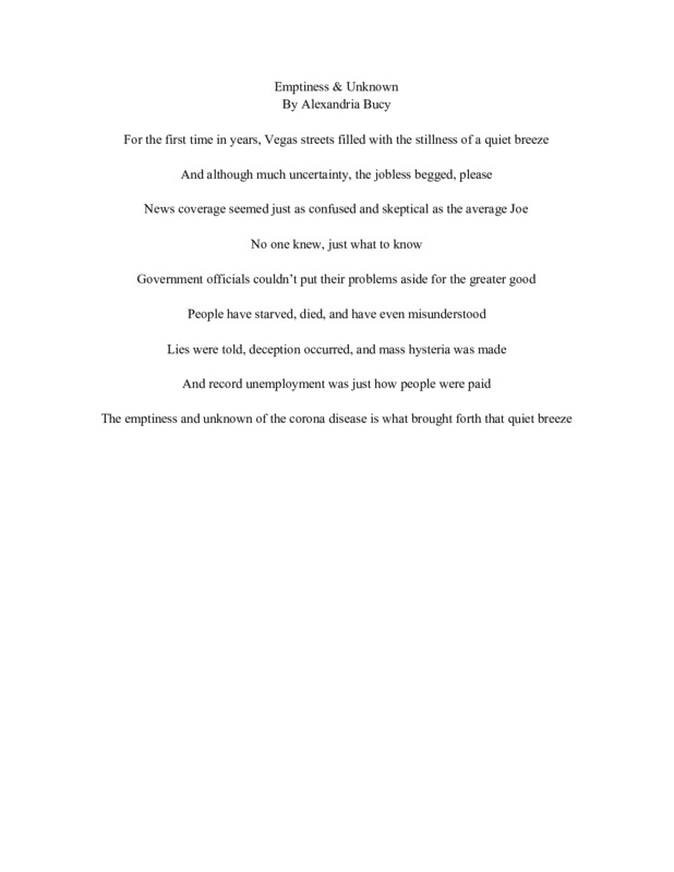 What it does means to me is that our bright and beautiful city which was active was dead, it was a ghost town. It showed that at that time the Governor Steve Sisolak needed to make a very difficult decision and shut down our country in order to protect the Nevadans. But it came at a risk of shutting down our economy many Nevadans have been hurt recently, When it came to the federal government barely anything has been done. There are still millions of Americans who are struggling to put food on the table for their children and Congress can't put politics aside for the betterment of the American people. I was one of the lucky ones and I have been negatively affected so I don't know how it must of felt for the Americans who are struggling but I know it must be painful.