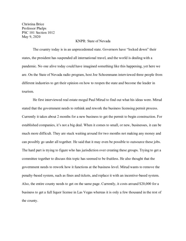 One of the most common assignments given in PSC 100 (Nevada Constitution) and PSC 101 (Introduction to American Politics) is a paper summarizing a segment of the Nevada National Public Radio’s program The State of Nevada. All students who graduate from a Nevada public university are required to take a course covering the Nevada Constitution. UNLV alone offers over thirty 60-student PSC 100 courses, ten 45-student PSC 101 courses, and three 250-student PSC 101 courses. UNR offers these same courses. Therefore, many students write KNPR papers. This entry serves as a reference point for these papers in the archive.