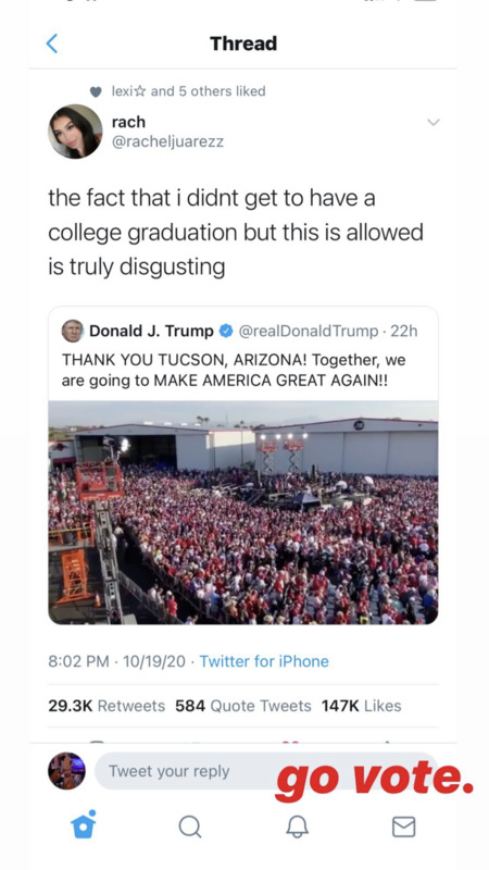 I recently graduated high school class of 2020 . Me and a lot of my friends didn't get a proper prom or graduation.The schools were the first thing the government shut down . Here we are months into a pandemic where new information about the virus is coming about .We have come accustomed to wearing masks and keeping distance. Meanwhile the president of the usa disregards the whole pandemic.While we the citizens have to face what's going on . It's completely unfair and unsafe. Everyone should follow the rules.