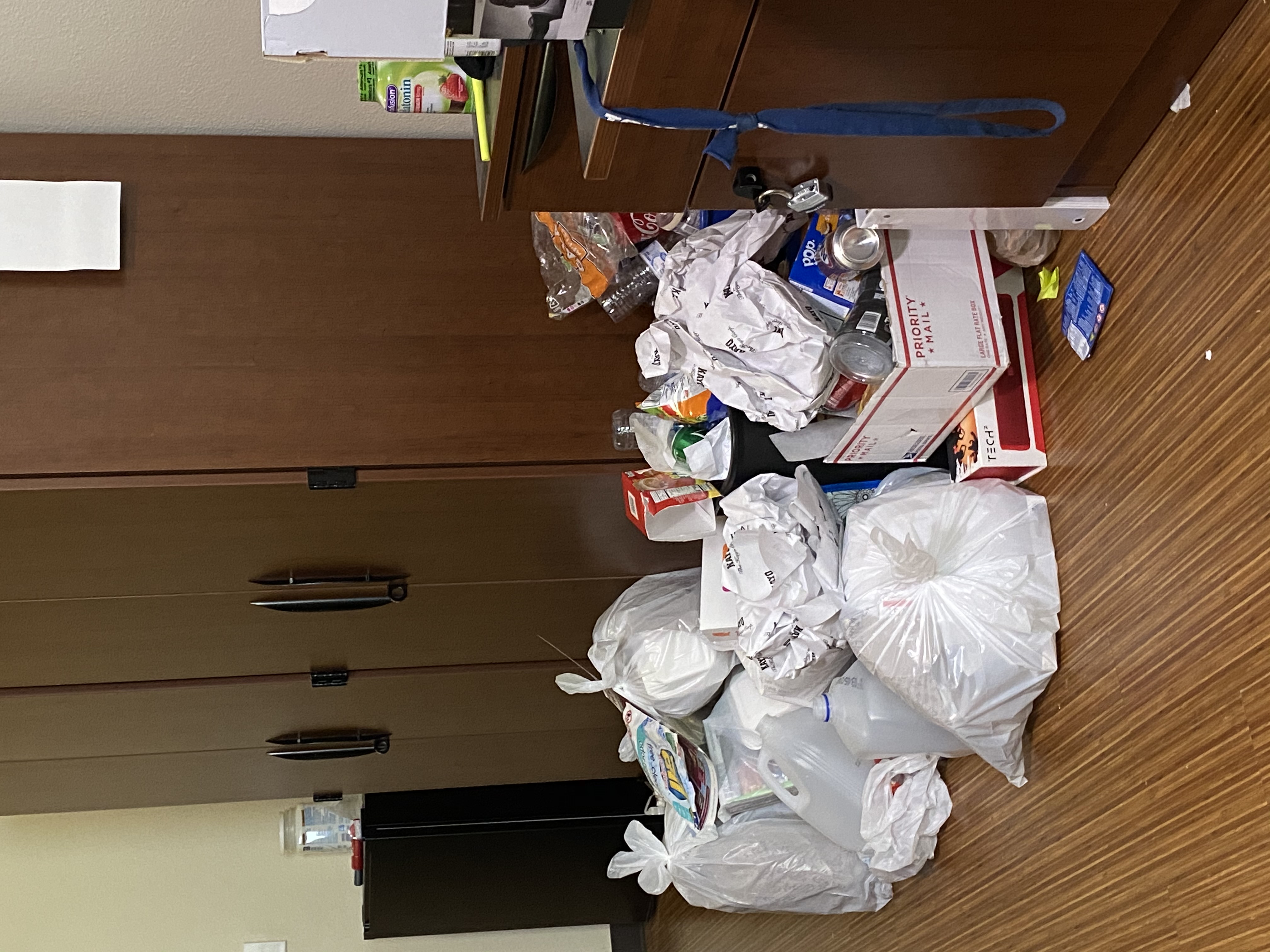 My college closed the trashrooms on all the floors so I have no place to put these bags of trash. But there is no bugs or anything. and its mostly empty wrappers and bottles so its doesn't smell either. I chose to pick this because it shows how much waste humans make just being stuck in the house for weeks.