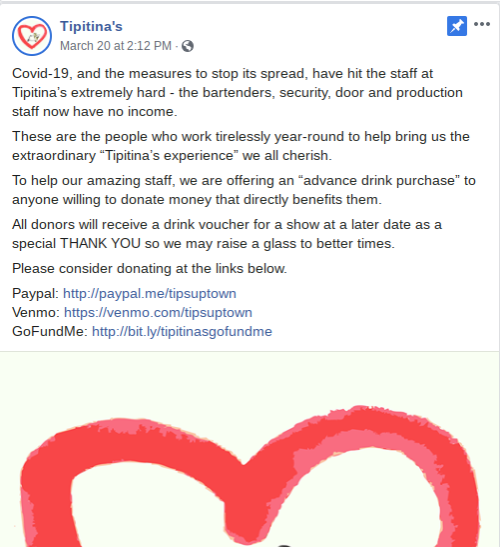 Tipitinia's, a music venue in New Orleans, LA, begins a fundraiser to support their staff who have no income while the venue is closed during the Covid-19 pandemic.