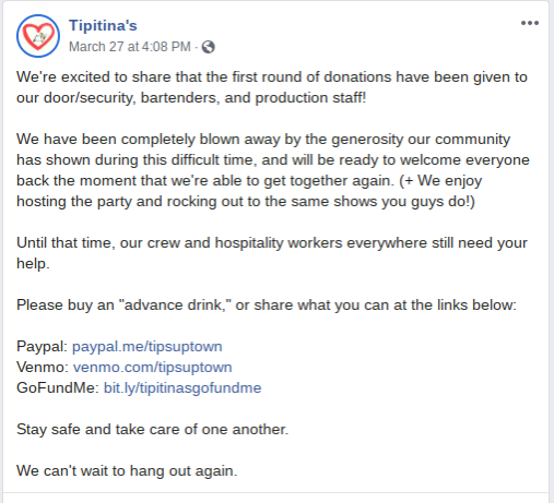 Tipitina's, a music venue in New Orleans, LA, disperses money to the venue's security, bartenders, and production staff who are out of work due to Covid-19.