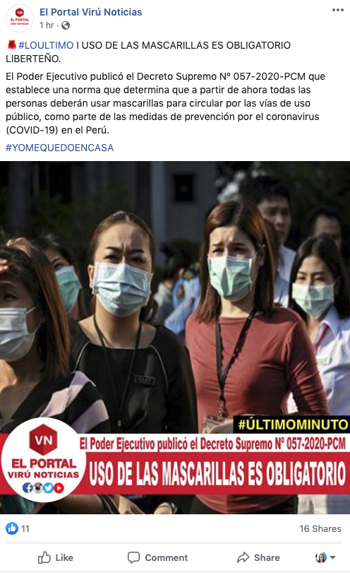 El Poder Ejecutivo publicó el Decreto Supremo Nº 057-2020-PCM que establece una norma que determina que a partir de ahora todas las personas deberán usar mascarillas para circular por las vías de uso público, como parte de las medidas de prevención por el coronavirus (COVID-19) en el Perú.