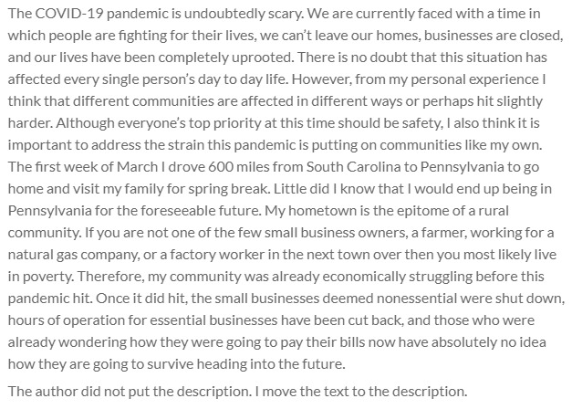 The first week of March I drove 600 miles from South Carolina to Pennsylvania to go home and visit my family for spring break. Little did I know that I would end up being in Pennsylvania for the foreseeable future. My hometown is the epitome of a rural community. If you are not one of the few small business owners, a farmer, working for a natural gas company, or a factory worker in the next town over then you most likely live in poverty. Therefore, my community was already economically struggling before this pandemic hit. Once it did hit, the small businesses deemed nonessential were shut down, hours of operation for essential businesses have been cut back, and those who were already wondering how they were going to pay their bills now have absolutely no idea how they are going to survive heading into the future.