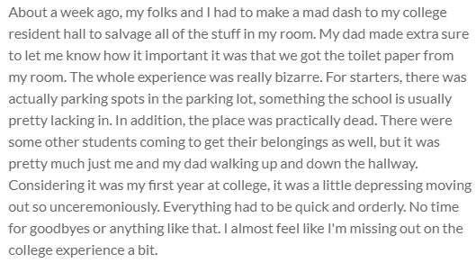 About a week ago, my folks and I had to make a mad dash to my college resident hall to salvage all of the stuff in my room. My dad made extra sure to let me know how it important it was that we got the toilet paper from my room. The whole experience was really bizarre. For starters, there was actually parking spots in the parking lot, something the school is usually pretty lacking in. In addition, the place was practically dead. There were some other students coming to get their belongings as well, but it was pretty much just me and my dad walking up and down the hallway. Considering it was my first year at college, it was a little depressing moving out so unceremoniously. Everything had to be quick and orderly. No time for goodbyes or anything like that. I almost feel like I'm missing out on the college experience a bit.