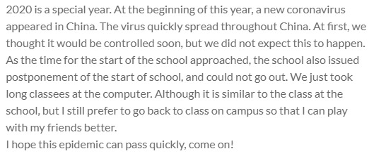2020 is a special year. At the beginning of this year, a new coronavirus appeared in China. The virus quickly spread throughout China. At first, we thought it would be controlled soon, but we did not expect this to happen.