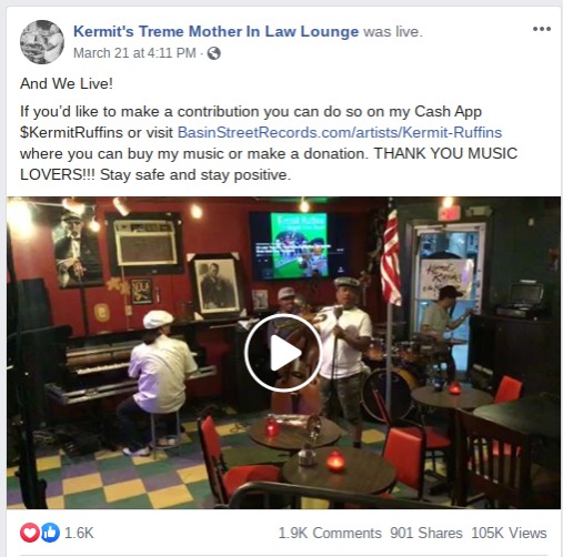 Kermit Ruffins and the BBQ Swingers stream a live performance from Mother in Law Lounge. Many New Orleans musicians, no longer able to work during the stay-at-home order, solicit donations from viewers for online performances during the pandemic.