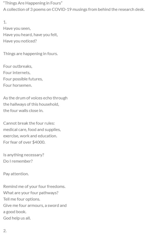 A collection of 3 poems on COVID-19 musings from behind the research desk.