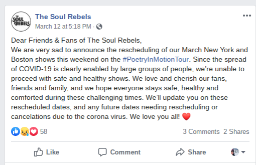 New Orleans brass band The Soul Rebels postpones their national tour due to the pandemic.