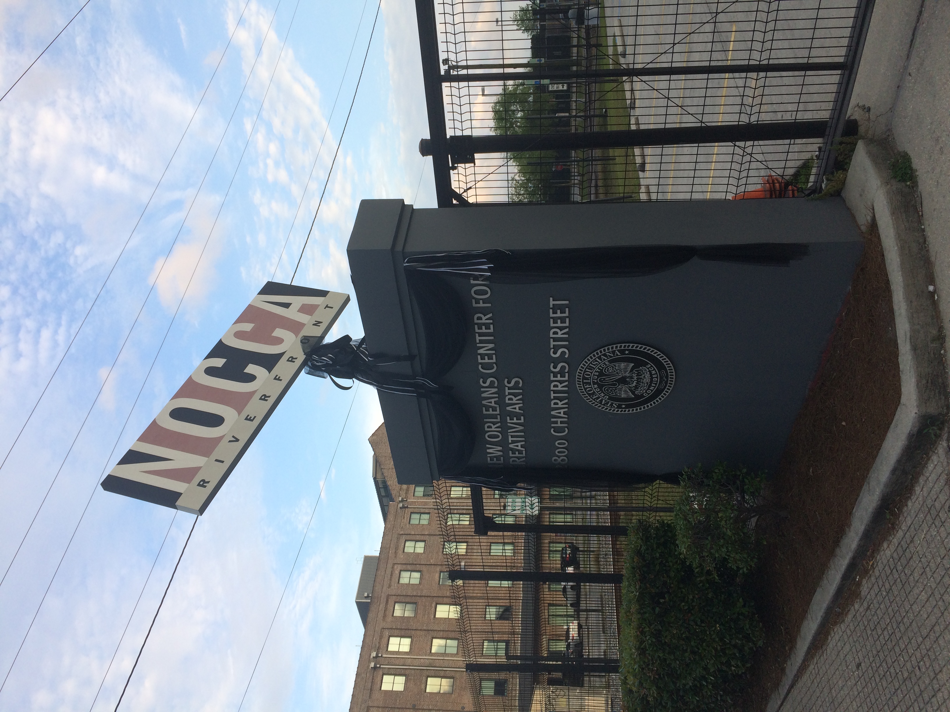 New Orleans Center for Creative Arts (NOCCA), shrouded in black cloth to mourn the passing of Ellis Marsalis, renowned pianist, music educator, and NOCCA Founder. Covid-19 caused Marsalis's death.
