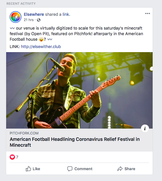 Open Pit and Anamanaguchi are throwing a coronavirus relief virtual music festival on Saturday, April 11 that takes place within the video game world of Minecraft. It’s called Nether Meant and it’s set to feature performances from American Football, Anamanaguchi, Baths, HANA, and more. Nether Meant takes place in a fictional space called Elsewither, which is based on the Brooklyn venue Elsewhere (Elsewhere worked jointly with the Open Pit team to create this space). The event starts at 6 p.m. Eastern.