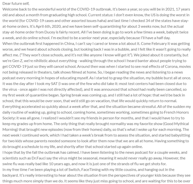 When the outbreak first happened in China, I can’t say I cared or knew a lot about it. Come February it was getting worse, and we heard about schools closing, but looking back I was in a bubble, and I felt like it wasn’t going to really affect me. (“They won’t close schools, and it’s not like anyone I know will get it”). We joked about it constantly, but we’re Gen Z, we’re nihilistic about everything - walking through the school I heard banter about people trying to get COVID-19 just so they will cancel school. Around then was when I started to see real effects of Corona, movies not being released in theaters, talk shows filmed at home. So, I began reading the news and listening to a news podcast every morning in hopes of educating myself. As I started to grasp the situation, my bubble burst all at once. It was the day after I took my SAT (I was one of the few who did take it: most test centers had been closed due to the virus - once again I was not directly affected), and it was announced that school had really been cancelled, so my first week of quarantine began. Spring break was coming up, and I still had a lot of hope: that we’d be back in school, that this would be over soon, that we’d still go on vacation, that life would quickly return to normal. Everything accelerated so quickly about a week after that, and the situation became stressful. All of the sudden my daily routine of waking up, going to school, coming home, sometimes working, sometimes going to French Honors Society: it was all gone. I realized I wouldn’t see my friends in person for months, and that I would have to try to keep my grades up from home. The only thing that really brought normality was my favorite show (Good Mythical Morning) that brought new episodes (now from their homes) daily, so that’s what I woke up for each morning. The next week I continued work, which I had taken a week’s break from to assess the situation, and started babysitting for two kids whose parents needed someone to look after them now that we are all at home. Having something to do brought a schedule to my life, and shortly after that school started up again online.