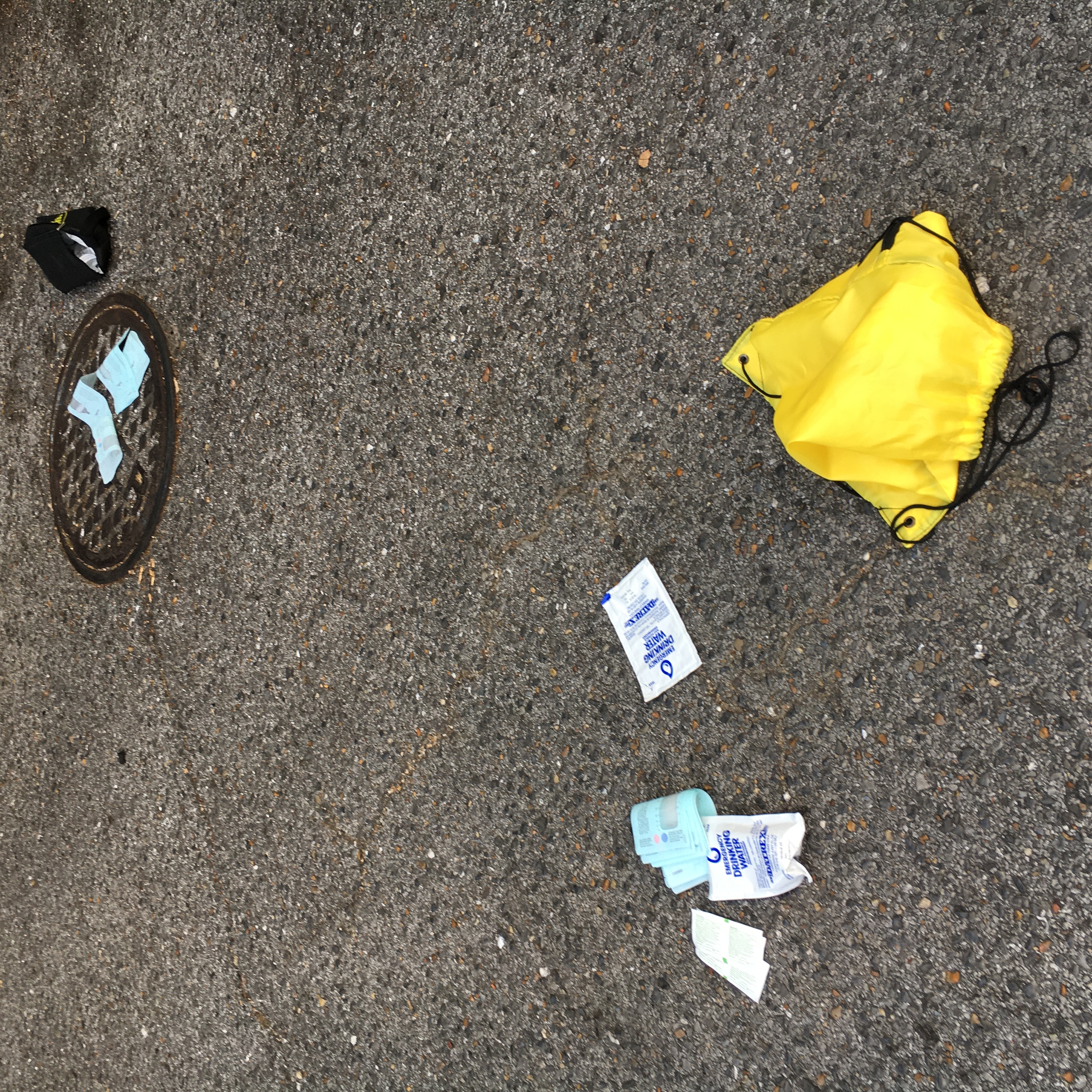 These emergency water packets were lying in the middle of Orchid Street on an early Tuesday morning. Accident? Litter?