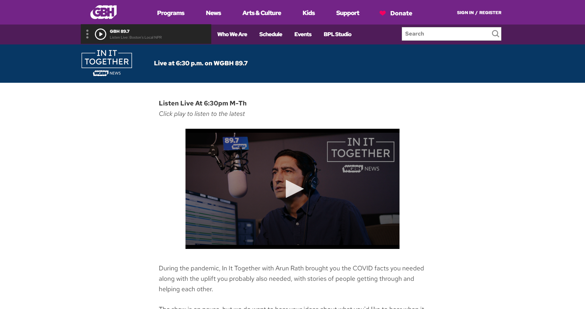 During this time of social isolation, you're not alone. WGBH is here to help you navigate this strange moment that we all find ourselves in. Host Arun Rath talks with experts, doctors, community leaders to provide the latest COVID-19 information on what's happening in Massachusetts. The Coronavirus might stop us from gathering in person, but it can’t stop us from connecting — we're in it together.