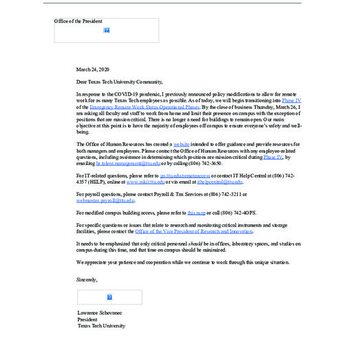 Texas Tech University Move to Phase IV 03/24/2020