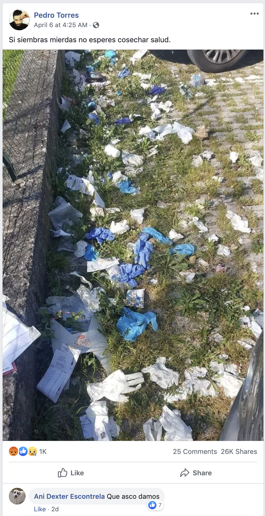 Facebook post about people throwing their used gloves on the ground like trash