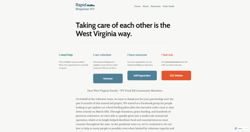 Funded by For WV's Future, this site is a joint effort by WV non-profits to help West Virginians during this crisis. Many people are out of work and need money, so various groups have formed around the country to help those that they can. #NortheasternJOTPY