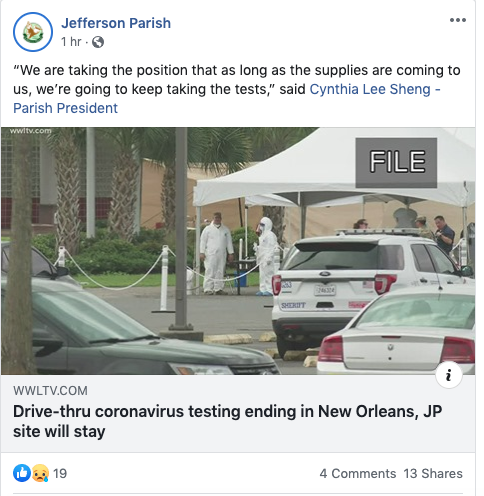 Drive-thru Testing to Continue, Jefferson Parish, LA