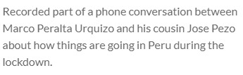 Recorded part of a phone conversation between Marco Peralta Urquizo and his cousin Jose Pezo about how things are going in Peru during the lockdown.