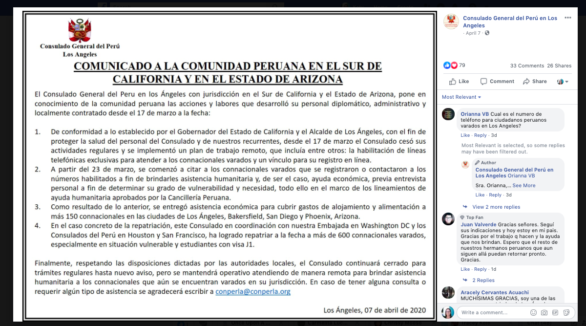 El Consulado General del Peru en los Ángeles con jurisdicción en el Sur de California y el Estado de Arizona, pone en conocimiento de la comunidad peruana las acciones y labores que desarrolló su personal diplomático, administrativo y localmente contratado desde el 17 de marzo a la fecha: