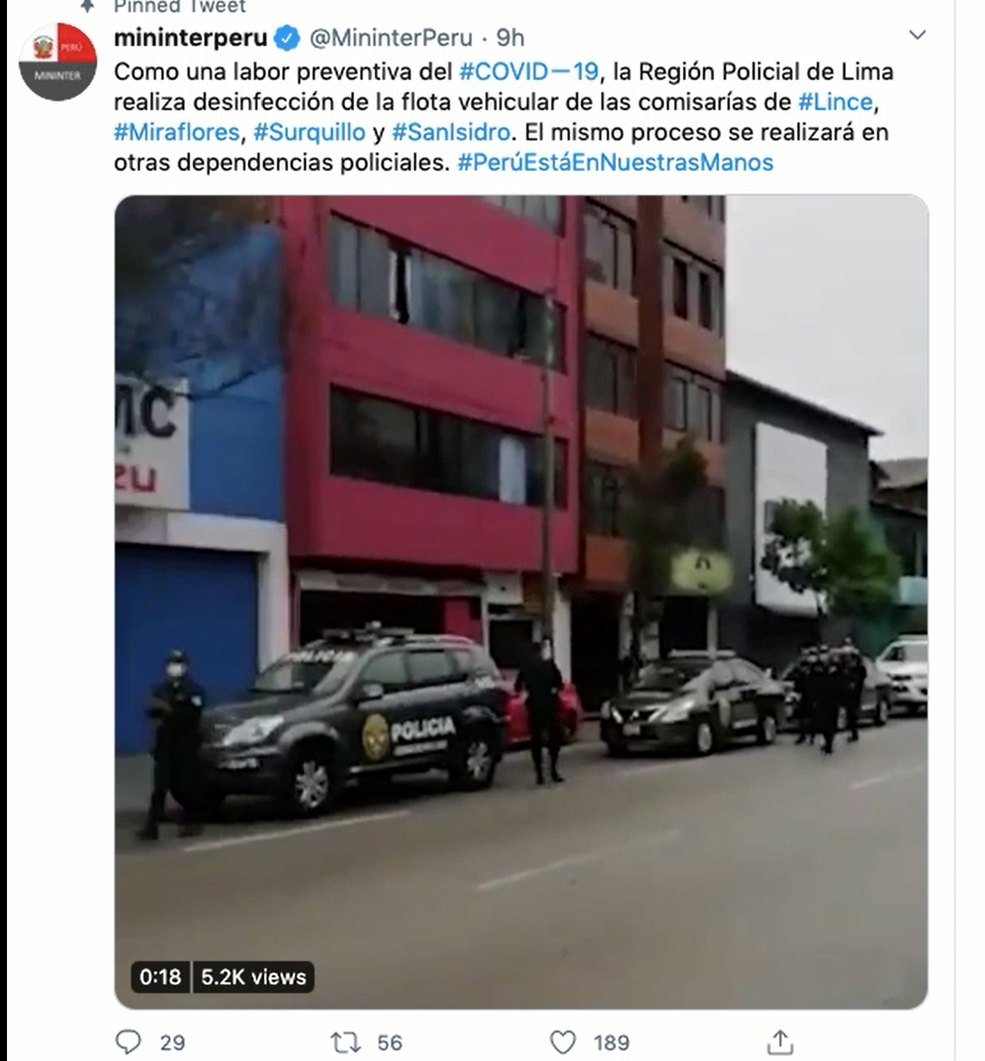 Como una labor preventiva del #COVIDー19, la Región Policial de Lima realiza desinfección de la flota vehicular de las comisarías de #Lince, #Miraflores, #Surquillo y #SanIsidro. El mismo proceso se realizará en otras dependencias policiales. #PerúEstáEnNuestrasManos