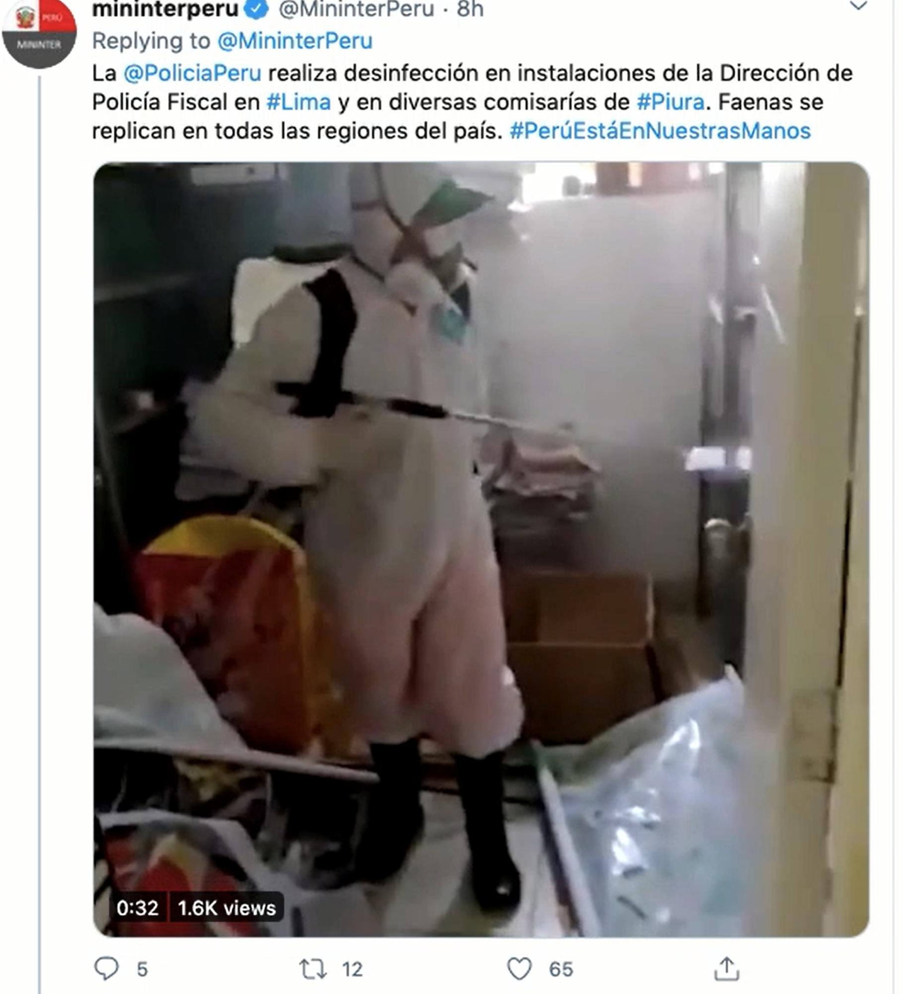 @PoliciaPeru carries out disinfection in facilities of the Fiscal Police Directorate in #Lima and in various police stations in #Piura. Tasks are replicated in all regions of the country. #PerúIsInOurHands