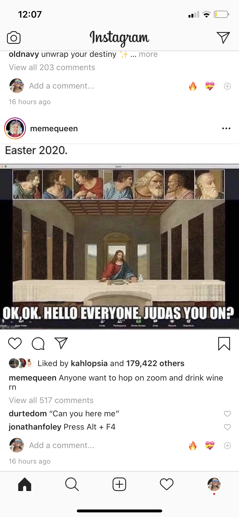 The COVID-19 Pandemic has lasted through Easter now and of course the Last Supper reference makes sense. With the increased use of Zoom by schools, businesses, and families the post imagines the Last Supper happening over Zoom.