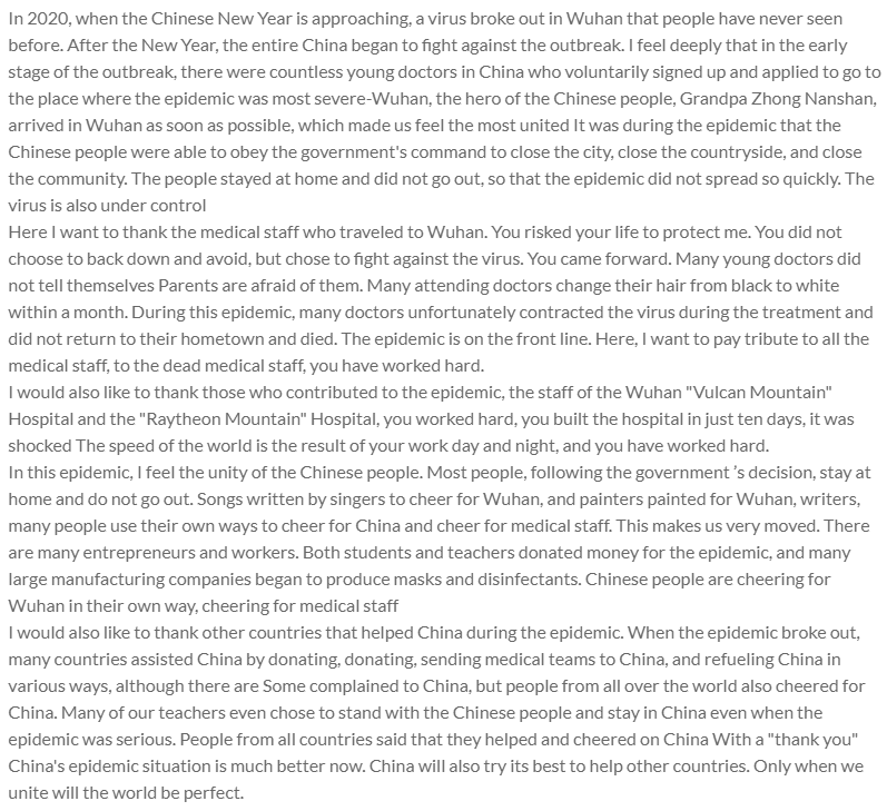 I would also like to thank other countries that helped China during the epidemic. When the epidemic broke out, many countries assisted China by donating, donating, sending medical teams to China, and refueling China in various ways, although there are Some complained to China, but people from all over the world also cheered for China. Many of our teachers even chose to stand with the Chinese people and stay in China even when the epidemic was serious. People from all countries said that they helped and cheered on China With a "thank you" China's epidemic situation is much better now. China will also try its best to help other countries. Only when we unite will the world be perfect.