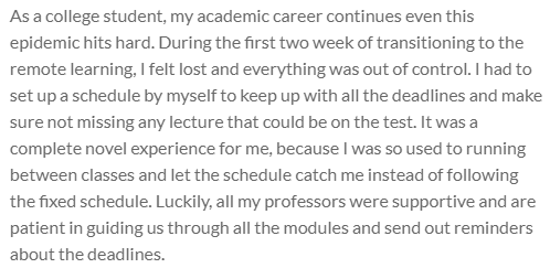 As a college student, my academic career continues even this epidemic hits hard. During the first two week of transitioning to the remote learning, I felt lost and everything was out of control. I had to set up a schedule by myself to keep up with all the deadlines and make sure not missing any lecture that could be on the test. It was a complete novel experience for me, because I was so used to running between classes and let the schedule catch me instead of following the fixed schedule. Luckily, all my professors were supportive and are patient in guiding us through all the modules and send out reminders about the deadlines.