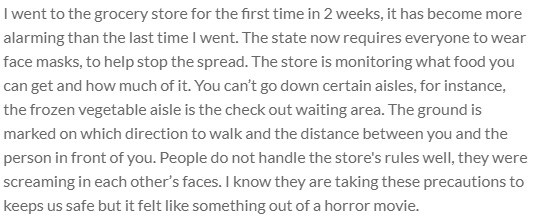 I went to the grocery store for the first time in 2 weeks, it has become more alarming than the last time I went. The state now requires everyone to wear face masks, to help stop the spread. The store is monitoring what food you can get and how much of it. You can’t go down certain aisles, for instance, the frozen vegetable aisle is the check out waiting area. The ground is marked on which direction to walk and the distance between you and the person in front of you. People do not handle the store's rules well, they were screaming in each other’s faces. I know they are taking these precautions to keeps us safe but it felt like something out of a horror movie.