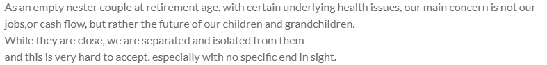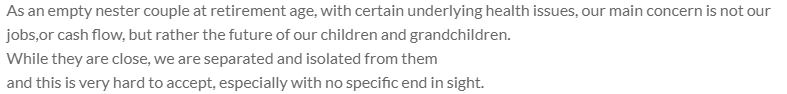 As an empty nester couple at retirement age, with certain underlying health issues, our main concern is not our jobs,or cash flow, but rather the future of our children and grandchildren.