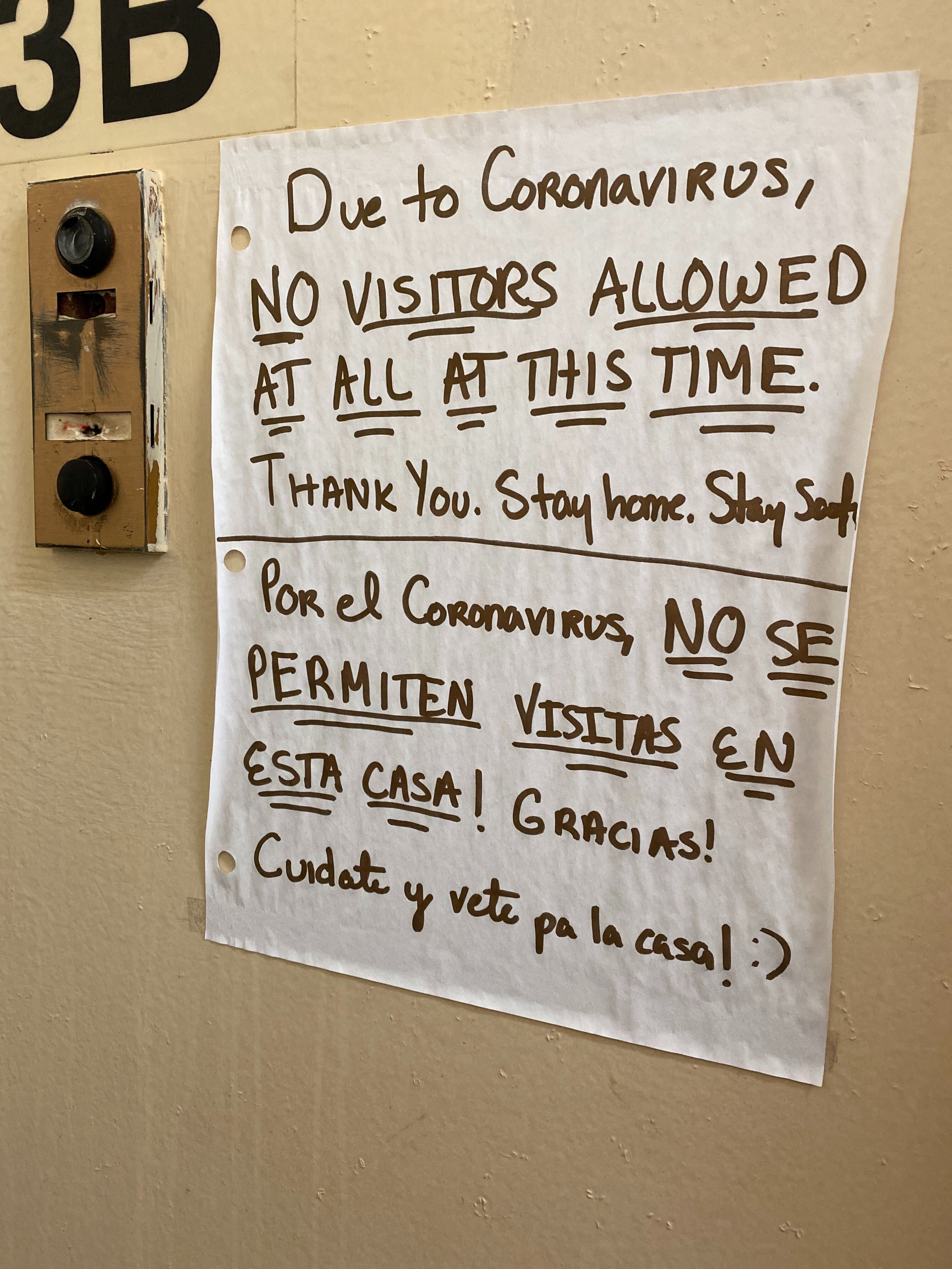 A neighbor makes it very clear that visitors are not to enter their apartment and in two languages just in case!
