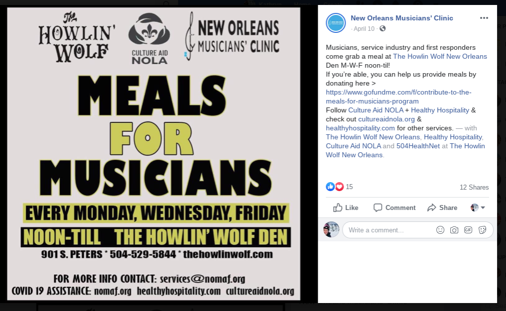 The Howlin' Wolf, Culture Aid NOLA, and New Orleans Musicians' Clinic provide free meals to musicians who are unable to work during COVID-19.